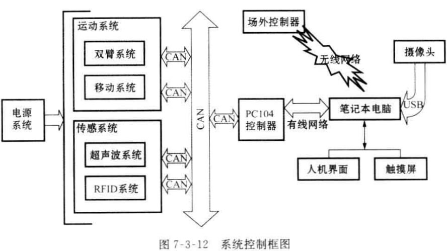 展廳機(jī)器人系統(tǒng)各硬件模塊主要由CAN 總線連接,通過統(tǒng)一的CAN總線協(xié)議將各模塊簡單地加載到系統(tǒng)中。系統(tǒng)主要由電源系統(tǒng)、運(yùn)動(dòng)控制系統(tǒng)、傳感系統(tǒng)等組成,其中運(yùn)動(dòng)控制系統(tǒng)包括雙臂系統(tǒng)及移動(dòng)系統(tǒng),傳感器系統(tǒng)包括超聲波系統(tǒng)、RFID定位系統(tǒng)、視覺系統(tǒng)組成。具體結(jié)構(gòu)由圖7-3-12所示。