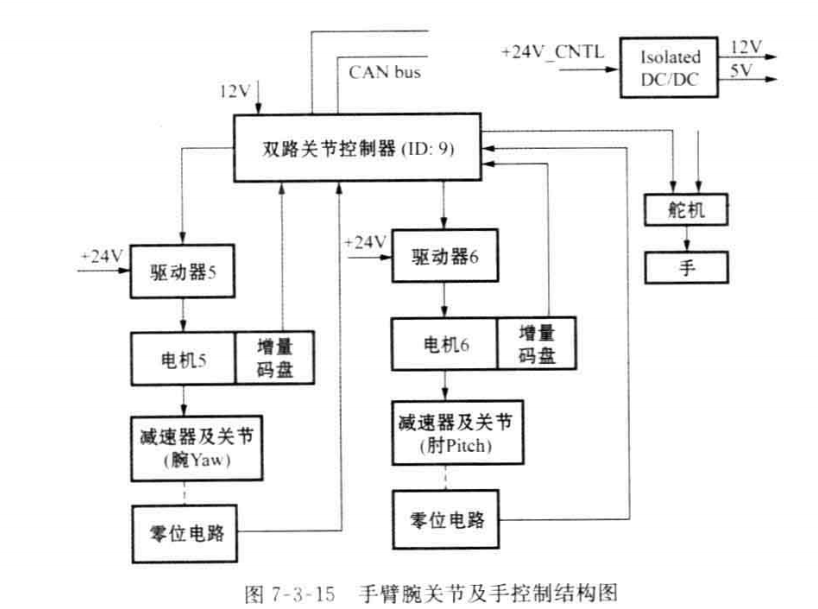 手臂各關(guān)節(jié)控制電路采用分布式控制系統(tǒng),各關(guān)節(jié)控制器(主 MCU 是 TMS320LF2407)由CAN 總線相連(CAN2.0-A 版本)?刂浦芷跒5m (即上位機(jī) 與 所 有 關(guān) 節(jié) 控 制 器 通 信 一 遍 , 再 加 一 定 裕 度 后 的 時(shí) 間 ) 。 各 關(guān) 節(jié) 控 制 電 路 結(jié) 構(gòu) 如 圖7 - 3 - 13、圖7 - 3 - 14及圖7 - 3 - 15所示。
