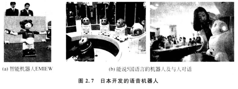 日本日立公司也研制了一臺(tái)智能機(jī)器人EMIEW, 它的個(gè)頭和小孩一樣,依靠輪子移 動(dòng),如圖2.7(a)所示。由于身上裝有數(shù)碼相機(jī)和雷達(dá)探測器,它可以自動(dòng)地躲避障礙物。 同時(shí)它的詞匯儲(chǔ)備量達(dá)到100多個(gè),能夠?qū)σ恍┖唵蔚穆曇糁噶钭龀龇磻?yīng),并且還能夠 和人進(jìn)行簡單的對(duì)話交流,甚至播報(bào)天氣預(yù)報(bào)等。第二代 EMIEW2 機(jī)器人可以通過無 線電裝置接收指令,然后毫不費(fèi)力地在辦公室之間來回奔波,為辦公室人員跑腿。它站 立時(shí)身高大約為31.5英寸,體重為29磅。它能夠?qū)φ系K物應(yīng)付自如,對(duì)人的語音做出 回應(yīng),并且一次充電后即可工作1小時(shí)。此外,能說5國語言的機(jī)器人及與人對(duì)話的機(jī) 器人也已經(jīng)誕生了,如圖2.7(b) 所示。在我國舉辦的日語演講大賽現(xiàn)場上,參加比賽的 選手以及日語院校的學(xué)生不但與該機(jī)器人進(jìn)行了交流互動(dòng),而且該機(jī)器人還獻(xiàn)上了許多 精彩舞蹈和歌曲。