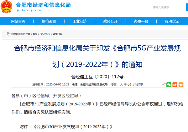 2020年6月1日,合肥市經(jīng)濟和信息化局印發(fā)《合肥市5G產(chǎn)業(yè)發(fā)展規(guī)劃(2019-2022年)》。