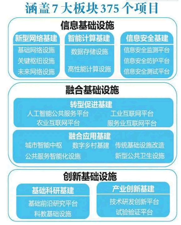 據(jù)《方案》,這批重大項(xiàng)目包括信息基礎(chǔ)設(shè)施、融合基礎(chǔ)設(shè)施、創(chuàng)新基礎(chǔ)設(shè)施3個(gè)方面,細(xì)分為新型網(wǎng)絡(luò)、智能計(jì)算、信息安全、轉(zhuǎn)型促進(jìn)、融合應(yīng)用、基礎(chǔ)科研、產(chǎn)業(yè)創(chuàng)新7大板塊。