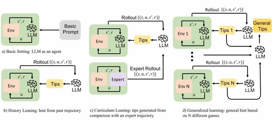 這種方法在很少或沒(méi)有示例的情況下提G了代理的表現(xiàn),考慮了三個(gè)重要場(chǎng)景:從代理過(guò)去的經(jīng)驗(yàn)中學(xué)習(xí)、集成專家演示,并泛化到不同的游戲。