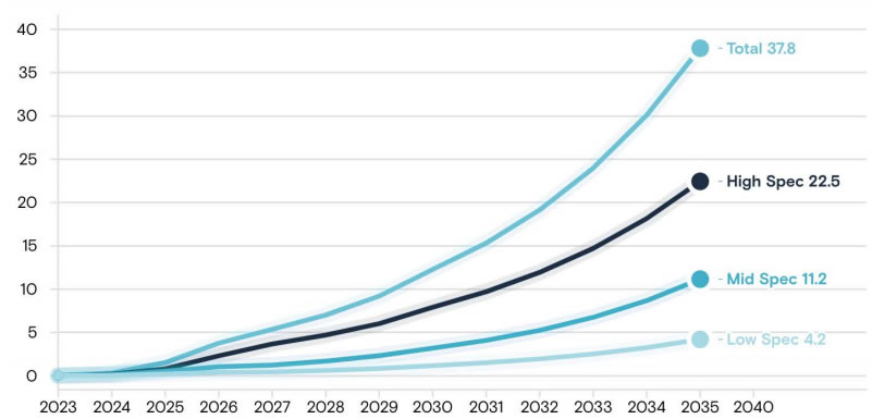 的總收入,到2050年可能產(chǎn)生約1萬(wàn)億美元的總收入!边@一預(yù)測(cè)表明市場(chǎng)增長(zhǎng)將出現(xiàn)急劇加速,特別是在2040年至2050年期間。