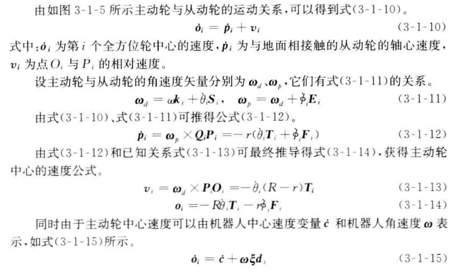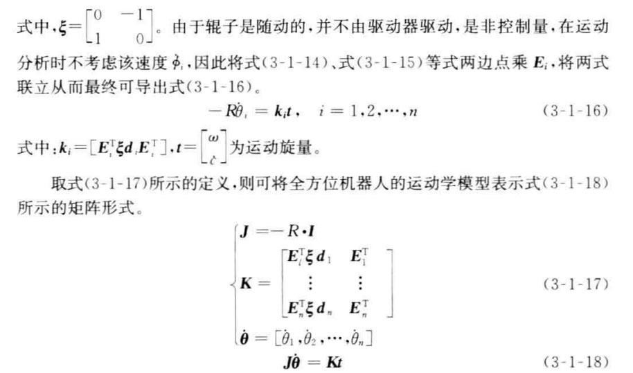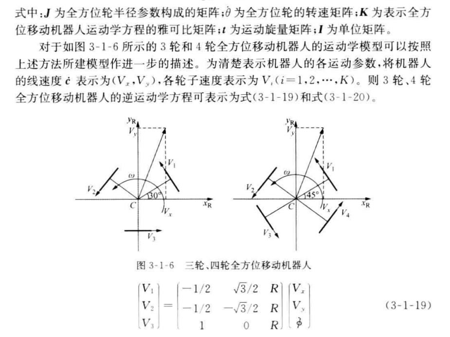 具有傳統(tǒng)車輪的機器人只能有兩個自由度的運動,所以在運動學(xué)上,它等價于 傳統(tǒng)的陸上車輛。然而,具有全方位輪的機器人有3個自由度運動的能力,即沿著 平面上x 軸、y 軸以及繞自身中心旋轉(zhuǎn)的運動能力,這充分增加了機器人的機動 性。本節(jié)將給出這種全方位移動機器人的運動學(xué)模型。