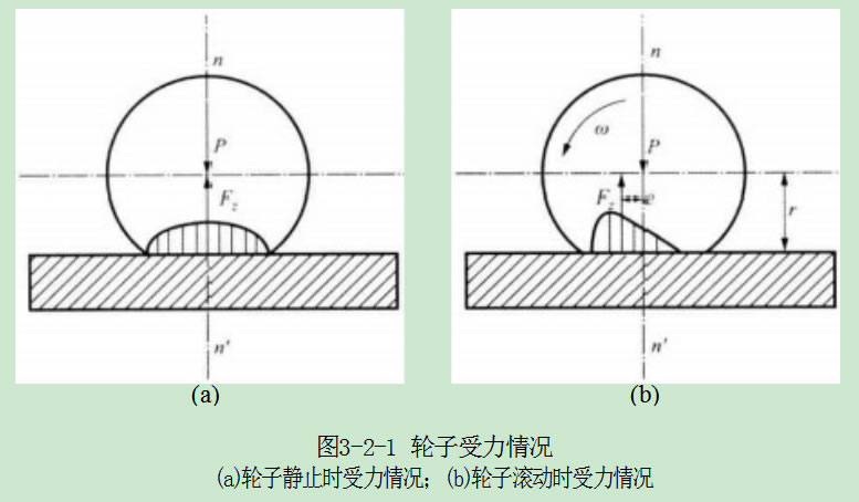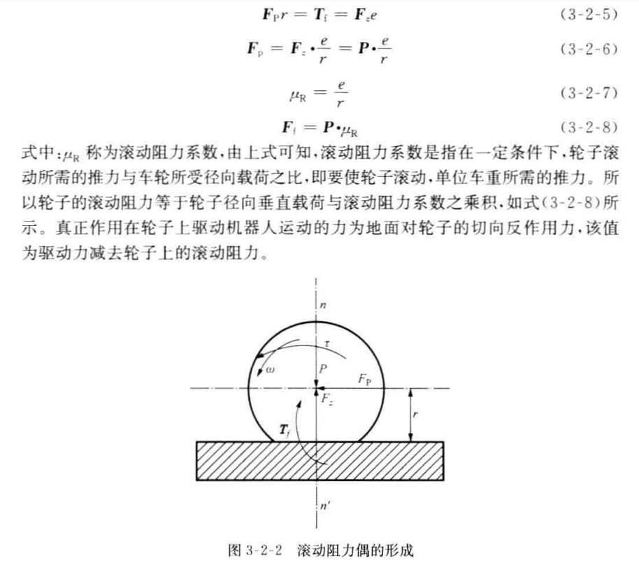 如果將法向反作用力F. 向后平移至通過輪子中心,與其垂線重合,則輪子在 地面上滾動時的受力情況如圖3-2-2所示,出現一個附加的力偶矩T=F,e, 這個 阻礙車輪滾動的力偶矩稱為滾動阻力偶矩。由圖3-2-2可知,欲使輪子在地面上 保持勻速滾動,需要在輪軸上加一驅動力矩r 或是加一推力Fp, 從而克服上述滾 動阻力偶矩。相關數學關系如下所示。
