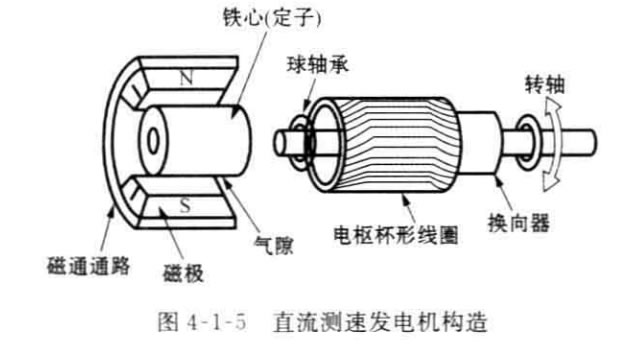 如圖4-1-5所示,直流測(cè)速發(fā)電機(jī)的定子是永久磁鐵,轉(zhuǎn)子是線圈繞組。它的 原理和永久磁鐵的直流發(fā)電機(jī)相同,轉(zhuǎn)子產(chǎn)生的電壓通過換向器和電刷以直流電 壓的形式輸出,可以測(cè)量0~10000r/min 量J的旋轉(zhuǎn)速度,線性度為0 . 1 % 。 此 外,停機(jī)時(shí)不易產(chǎn)生殘留電壓,因此,它Z適宜作速度傳感器。但是電刷部分是機(jī)械接觸,需要注意維修,另外,換向器在切換時(shí)產(chǎn)生脈動(dòng)電壓,使測(cè)量精度降低。因 此,現(xiàn)在亦有用無刷直流測(cè)速發(fā)電機(jī)。