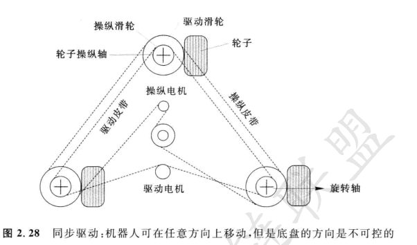 在室內(nèi)移動機器人應用中,同步驅(qū)動結(jié)構(gòu)(圖2.28)是一種流行的輪子裝配,也是 一個令人很感興趣的結(jié)構(gòu)。因為它雖然有3個驅(qū)動和操縱輪,可是總共只用了2個電機。一個平移電機設置3個輪子一起的速度; 一個操縱電機,使所有輪子繞著它們 各自的垂直操縱軸一起旋轉(zhuǎn)。但要注意的是,輪子是相對于機器人的底盤受操縱的, 所以,沒有直接方法重新設定機器人底盤的方向。實際上,由于凹凸不平輪胎的滑動,在整個時間里底盤方向一定會漂移,造成旋轉(zhuǎn)的航位測定誤差。
