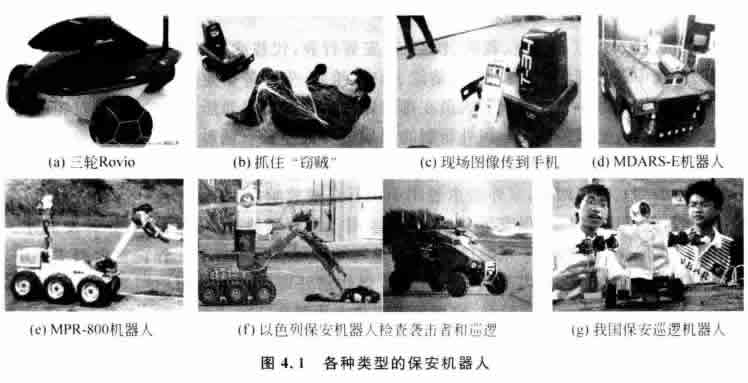 美國(guó)的一家公司正在研制一種多用途保安機(jī)器人MPR-800, 它可用于掃雷、滅火、核 生化污染清除等多項(xiàng)危險(xiǎn)工作,如圖4.1(e) 所示。以色列的保安機(jī)器人也非常先進(jìn),除 了可以檢查恐怖襲擊者外,還可以保障飛機(jī)跑道的安全,如圖4.1(f)所示。俄羅斯研制 的D一個(gè)保安機(jī)器人已于2007年6月開始正式在彼爾姆市街頭巡邏,該保安機(jī)器人質(zhì) 量為250kg, 身高180cm, 配備有5臺(tái)照相機(jī)和供路人使用的求助按鈕。并且它還會(huì)發(fā)出 一些簡(jiǎn)單的指令,例如勸誡人們不要在街上酗酒滋事等。此外,我國(guó)東莞理工學(xué)院的大 學(xué)生也設(shè)計(jì)了一個(gè)保安巡邏機(jī)器人,如圖4.1(g) 所示。它以太陽(yáng)能為主,電動(dòng)小車為載 體,采用多種高性能傳感器自動(dòng)地檢測(cè)障礙物和完成自動(dòng)值守、報(bào)警等各種保安任務(wù)。 它能在校園和小區(qū)及其他環(huán)境下完成巡邏監(jiān)控,或者與固定監(jiān)控設(shè)備組成一個(gè)嚴(yán)密的監(jiān) 控網(wǎng)絡(luò)。