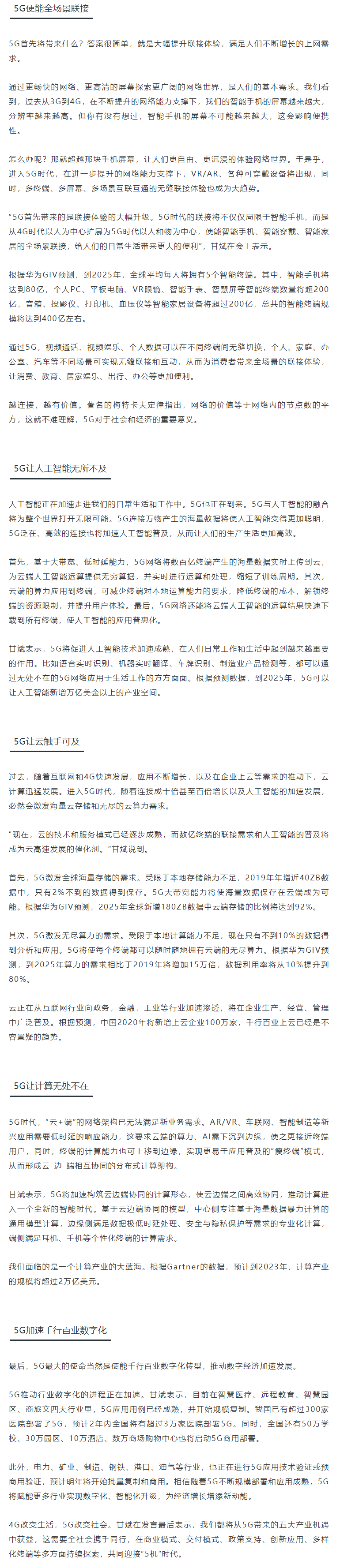 2020年6月30日,在GSMA舉辦的新基建與企業(yè)數(shù)字化論壇上,華為無線網(wǎng)絡S席營銷官甘斌發(fā)表了《5G=5“機”,新價值,新機遇》的主題演講。會上,甘斌詮釋了5G將驅(qū)動聯(lián)接、AI、云、計算、行業(yè)應用五大產(chǎn)業(yè)升級,為數(shù)字經(jīng)濟發(fā)展注入新動能。
