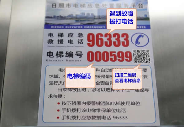 平臺對錄入的每臺電梯都進行了準確定位,并且在轎廂內(nèi)張貼標識牌,標識牌上有電梯應急救援電話“96333”以及每臺電梯對應的編號。市民乘坐電梯偶遇故障被困時,可撥打“96333”救援熱線電話,告知接線人員電梯編碼,即可對所乘電梯的所在小區(qū)、單元樓實施迅速定位,安排專業(yè)人員前去救援。市民在日常乘梯時也可憑借96333應急處置平臺的數(shù)據(jù)歸集,掃描標識牌二維碼,獲知電梯檢驗、維保、投保、管理等情況,參與電梯安全管理社會共治。