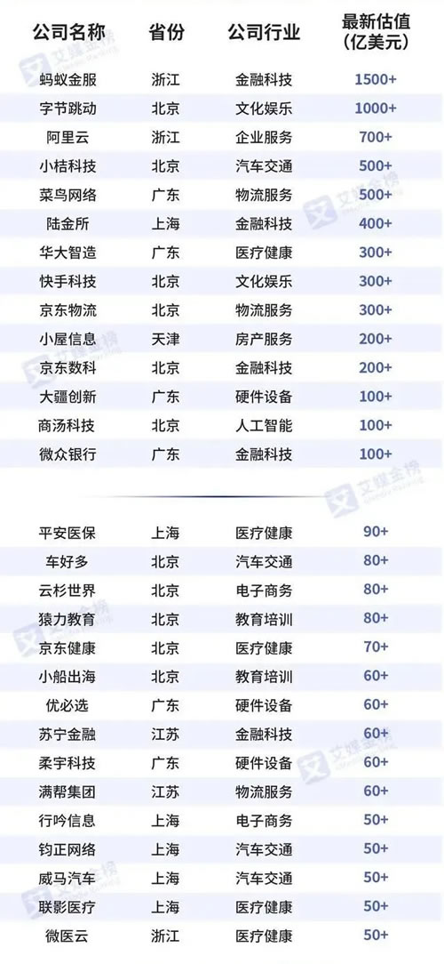 iiMedia Research(艾媒咨詢)數(shù)據(jù)顯示,2020中國新經(jīng)濟(jì)獨(dú)角獸200強(qiáng)榜單中,螞蟻金服、字節(jié)跳動、阿里云L居前3位,估值分別突破1500億美元、1000億美元、700億美元;此外排名前10的企業(yè)依次為小桔科技、菜鳥網(wǎng)絡(luò)、陸金所、華大智造、快手科技、京東物流、小屋信息,估值均在200億美元以上;排名11-20位的企業(yè)依次為京東數(shù)科、大疆創(chuàng)新、商湯科技、微眾銀行、平安醫(yī)保、車好多、云杉世界、猿力教育、京東健康、小船出海,估值均在60億美元以上。