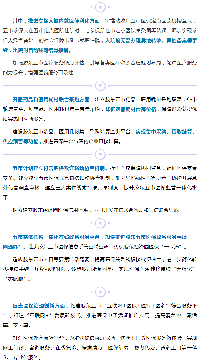 《行動方案》是在山東省醫(yī)保局指導(dǎo)下,由青島、煙臺、威海、濰坊、日照五市醫(yī)保局會商共同制定!缎袆臃桨浮访鞔_,通過構(gòu)建“就醫(yī)服務(wù)便捷、藥械采購協(xié)同、醫(yī)藥產(chǎn)業(yè)集聚、打擊騙保聯(lián)動、信息互通共享”的膠東五市醫(yī)保發(fā)展共同體,促進(jìn)五市醫(yī)保政策更加均衡,醫(yī)保服務(wù)更加便捷,醫(yī)藥價格更加優(yōu)惠,全力支持和服務(wù)膠東經(jīng)濟圈一體化發(fā)展大局。