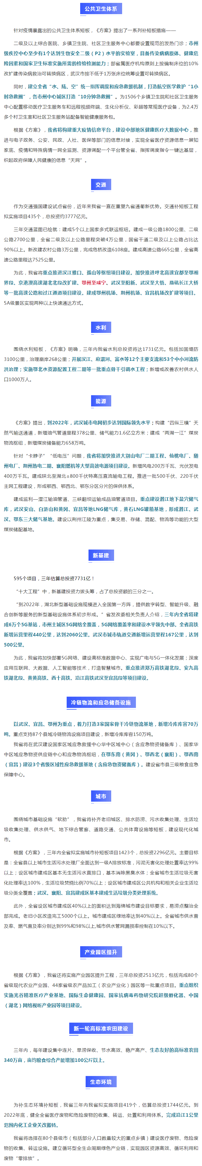 近日,湖北省印發(fā)《湖北省疫后重振補短板強功能“十大工程”三年行動方案(2020—2022年)》(以下簡稱《方案》),啟動疫后重振“十大工程”。 根據(jù)《方案》,我省將聚焦公共衛(wèi)生體系、交通、水利、能源、新基建、冷鏈物流和應急儲備設施、城市、產(chǎn)業(yè)園區(qū)提升、新一輪G標準農(nóng)田建設、生態(tài)環(huán)境等十大L域,用三年時間實施一批打基礎、補短板、強功能、利長遠、惠民生的重大項目。截至目前,“十大工程”滾動項目庫項目達4572個,估算總投資約2.3萬億元。