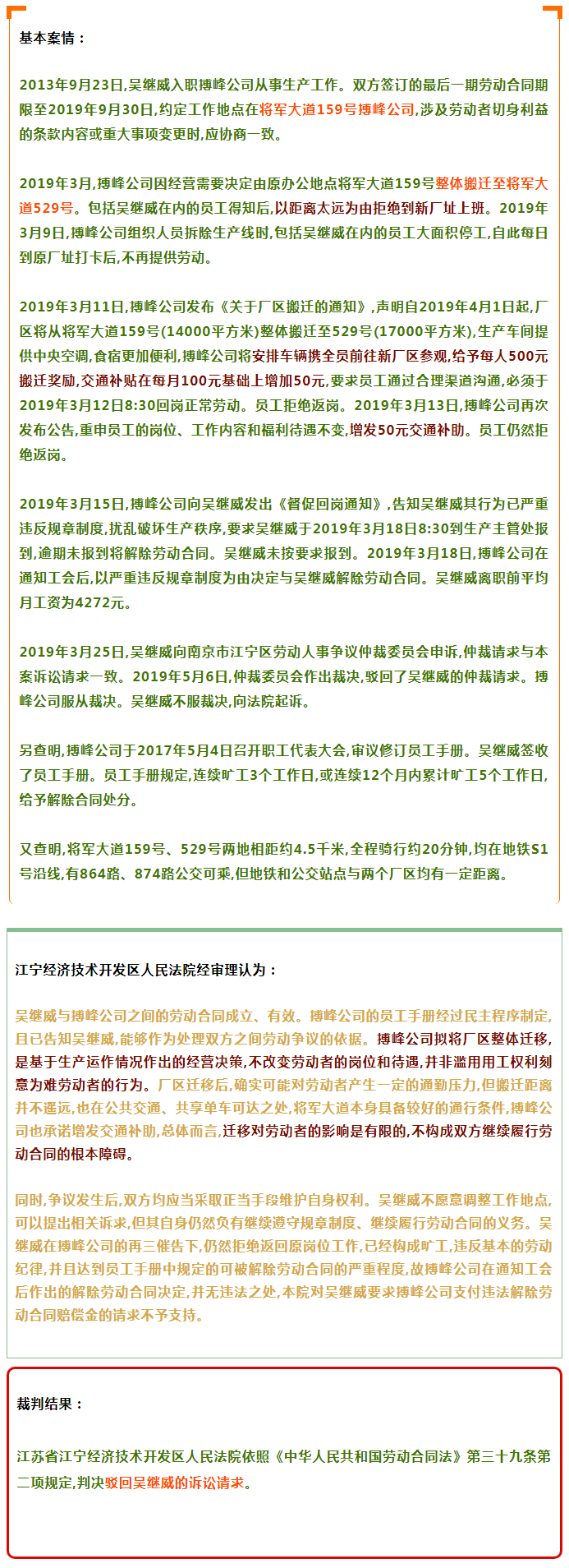 案例要旨:用人單位整體搬遷導(dǎo)致勞動(dòng)者工作地點(diǎn)變更、通勤時(shí)間延長的,是否屬于《中華人民共和國勞動(dòng)合同法》第四十條第三項(xiàng)規(guī)定的“勞動(dòng)合同訂立時(shí)所依據(jù)的客觀情況發(fā)生重大變化,致使勞動(dòng)合同無法履行”的情形,需要考量搬遷距離遠(yuǎn)近、通勤便利程度,結(jié)合用人單位是否提供交通工具、是否調(diào)整出勤時(shí)間、是否增加交通補(bǔ)貼等因素,綜合評判工作地點(diǎn)的變更是否給勞動(dòng)者的工作和生活帶來嚴(yán)重不便并足以影響勞動(dòng)合同的履行。如果用人單位已經(jīng)采取適當(dāng)措施降低了搬遷對勞動(dòng)者的不利影響,搬遷行為不足以導(dǎo)致勞動(dòng)合同無法履行的,勞動(dòng)者不得以此為由拒J提供勞動(dòng)。