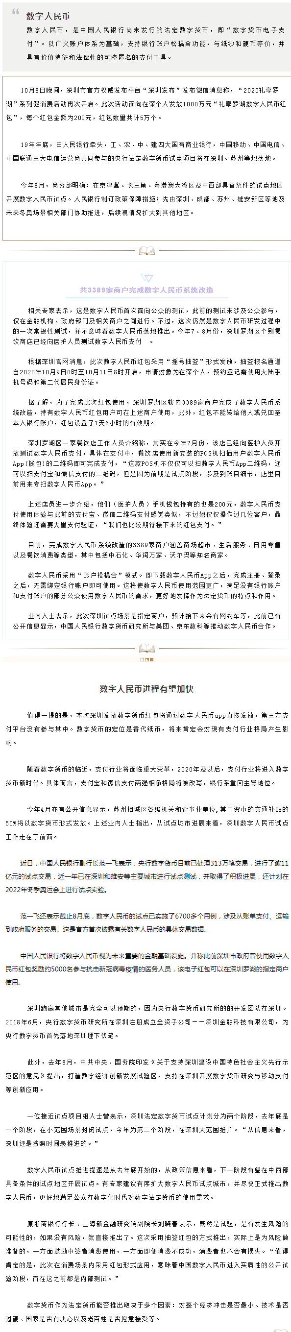 方案要求在中國人民銀行數(shù)字貨幣研究所深圳下屬機構(gòu)的基礎(chǔ)上成立金融科技創(chuàng)新平臺。支持開展數(shù)字人民幣內(nèi)部封閉試點測試,推動數(shù)字人民幣的研發(fā)應用和國際合作