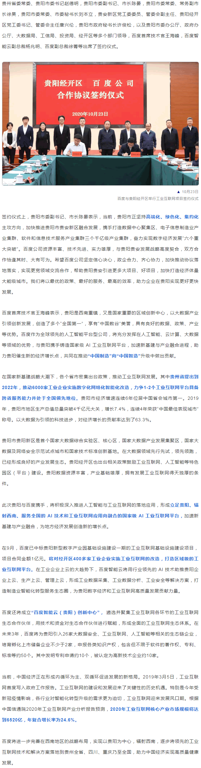 10月23日,百度與貴州省貴陽(yáng)市政府正式簽署戰(zhàn)略合作協(xié)議,與貴陽(yáng)經(jīng)開(kāi)區(qū)舉行工業(yè)互聯(lián)網(wǎng)項(xiàng)目簽約儀式。百度將承接貴陽(yáng)經(jīng)開(kāi)區(qū)工業(yè)互聯(lián)網(wǎng)項(xiàng)目建設(shè),打造 AI 技術(shù)和工業(yè)互聯(lián)網(wǎng)應(yīng)用相融合的 AI 工業(yè)互聯(lián)網(wǎng)平臺(tái),形成多面的工業(yè)互聯(lián)網(wǎng)生態(tài)體系,助力貴陽(yáng)打造3個(gè)千億級(jí)產(chǎn)業(yè)集群,形成新的經(jīng)濟(jì)增長(zhǎng)點(diǎn)。