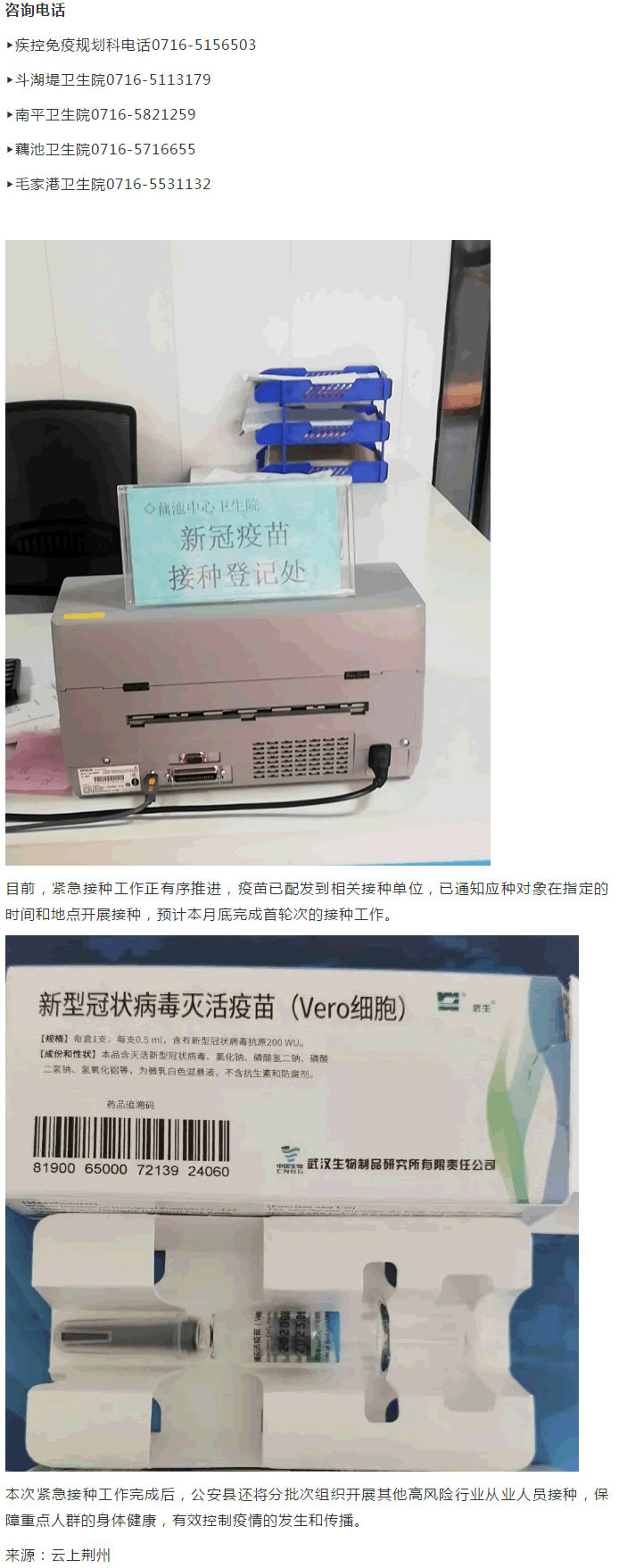 為使接種工作安全有序,公安縣確定了4家醫(yī)院承擔(dān)全縣新G疫苗緊急接種工作,優(yōu)先為冷鏈相關(guān)行業(yè)從業(yè)人員免費(fèi)接種新G疫苗,同時(shí)指定了縣人民醫(yī)院為新G疫苗緊急接種異常反應(yīng)定點(diǎn)處理醫(yī)院。