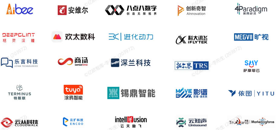 商湯科技,優(yōu)必選,科大訊飛,深蘭科技,影譜科技,依圖科技,曠視,云從科技,創(chuàng)新奇智,影創(chuàng)科技,進(jìn)化動(dòng)力,百應(yīng),靈犀,數(shù)美科技,雙太數(shù)科,飛步科技