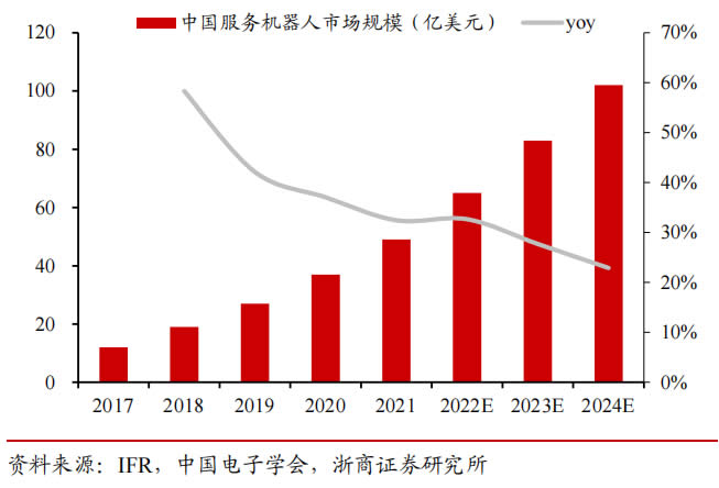 國內看,2024 年我國服務機器人市場規(guī)模將達 102 億美元,2020-2024 年 CAGR 約 29%。