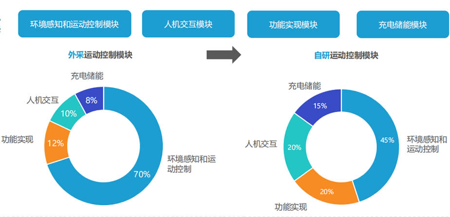 其中,人機(jī)交互模塊、功能實(shí)現(xiàn)模塊和充電儲(chǔ)能模塊基本實(shí)現(xiàn)自研。以往,環(huán)境感知和運(yùn)動(dòng)控制模塊會(huì)有部分企業(yè)選擇外采,但隨著技術(shù)的進(jìn)步以及成本考慮,現(xiàn)在多數(shù)機(jī)器人企業(yè)也實(shí)現(xiàn)了環(huán)境感知和運(yùn)動(dòng)控制模塊的自研。