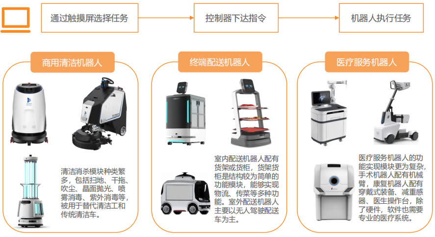 D一類:需要通過觸摸屏選擇任務(wù),控制系統(tǒng)下達(dá)指令才能執(zhí)行任務(wù),例如清潔機(jī)器人、終端配送機(jī)器人、醫(yī)療服務(wù)機(jī)器人;