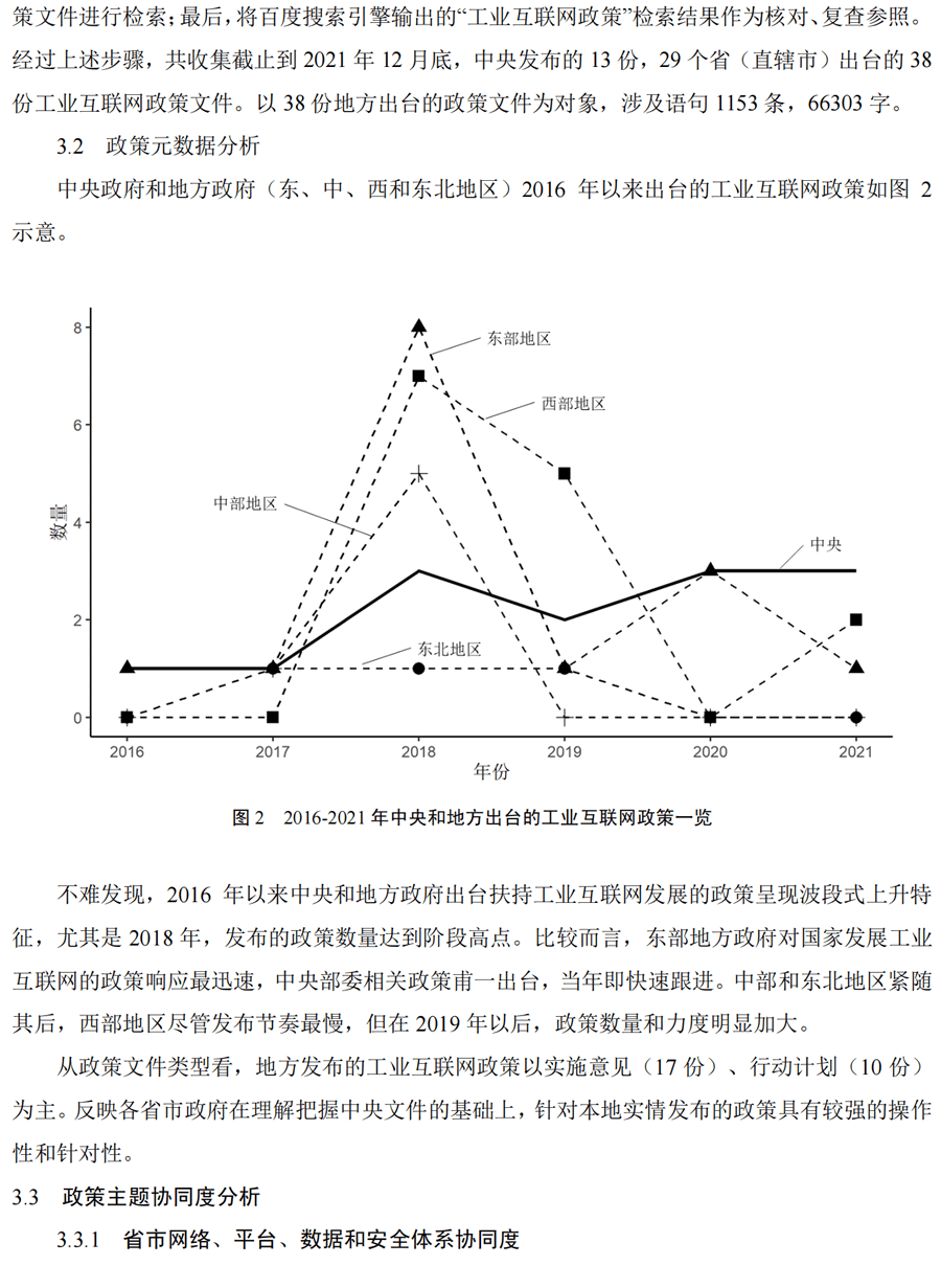 現(xiàn)有研究多圍繞工業(yè)互聯(lián)網(wǎng)架構(gòu)、標(biāo)準(zhǔn)和平臺(tái)體系展開(kāi),較少分析地方政府對(duì)四大功能體系 建設(shè)的政策導(dǎo)向。本文一方面應(yīng)用協(xié)同度算法評(píng)價(jià)地方政策體系協(xié)同水平,識(shí)別體系協(xié)同短板, 另一方面總結(jié)東、中、西和東北地區(qū)地方政策建設(shè)工業(yè)互聯(lián)網(wǎng)的側(cè)重點(diǎn)差異。